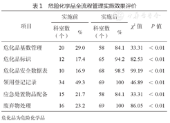 危险化学品的全流程管理具体实践操作主要体现在危险化学品基数管理、危险化学品标识、SDS、领用登记记录、应急处置物品配备、废弃物处理等6个方面的执行情况。以我院为例,在实行危险化学品全流程管理前后对4个院区69个使用危险化学品的科室(病区)的危险化学品基数管理、危险化学品标识、SDS、领用登记记录、应急处置物品配备、废弃物处理等6个方面为衡量要素进行评价。在实行危险化学品全流程管理后,医院临床科室危险化学品的各项评价指标均上升,所有数据进行统计学分析,采取χ2检验,P <0.01为差异有统计学意义。具体如表1。