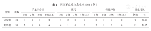 试验组的疾病缓解率、控制率(76.67%、93.33%)分别明显高于对照组(50.00%、70.00% ),差异有统计学意义(χ2值分别为4.593、5.455,P值均<0.05);试验组的不良反应发生率(30.00%)与对照组(36.67%)比较,差异无统计学意义(χ2=0.300,P>0.05)。