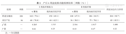 316例中,产后6周,Ⅰ类肌纤维肌力异常230例,肌肉疲劳度异常212例,Ⅱ类肌纤维肌力异常204例,肌肉疲劳度异常261例,阴道动态压力异常289例。两组Ⅰ类、Ⅱ类肌纤维肌力和肌肉疲劳度异常情况比较,差异无统计学意义(P值均>0.05)。两组间阴道动态压力异常的发生率比较差异亦无统计学意义(P >0.05),见表1。