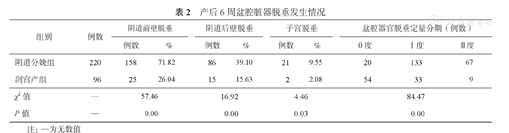 阴道分娩组阴道前壁脱垂、阴道后壁脱垂和子宫脱垂的发生率均明显高于剖宫产组,差异均有统计学意义(P值均<0.05 );POP-Q分期法评价脱垂程度两组比较差异有统计学意义(P值均<0.05 ),见表2。