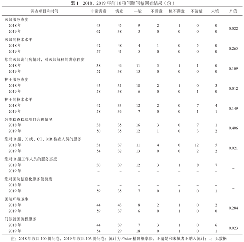 调查的主要内容是围绕服务流程、服务态度、服务质量和就医环境设计的12项问题,2018年的调查内容为:"医师服务态度""医师的技术水平""您向医师询问病情时,对医生解释的满意程度""护士服务态度""护士的技术水平""各类检查检验项目合理情况""您对B超工作人员的服务态度""您对X线、CT、MR检查人员的服务""医院环境卫生""门诊就医流程服务""如果您需要医疗保健服务,您会选择再来吗?""如果您的亲朋好友需要医疗保健服务,您会介绍他们来我院吗?",其中后2项问题的选项包括"会""不会"和"不一定"。在对结果进行统计时,将前10个问题分为4类。2019年将"您对X线、CT、MR检查人员的服务"与"您对B超工作人员的服务态度"合并为"您对B超、X线、CT、MR检查人员的服务"。随着门诊服务信息化的快速发展,很多医院实现了"一卡通"就医模式,所有科室之间也实现了信息联网,因此,在进行患者满意度调查时,增加了"您对医院信息化服务便捷度"这一项。其中服务流程是指患者在就医过程中每一个过程的流畅和衔接,包括"各类检查检验项目合理情况""门诊就医流程服务"类的问题。服务态度是指患者在就医过程中接触到的所有医护人员的态度,对患者的就医体验影响很大,包括:"医师服务态度""护士服务态度"类的问题。服务质量是指患者在就医过程中,医护人员的专业程度和解决问题的能力,包括"医师的技术水平""您向医师询问病情时,对医师解释的满意程度""护士的技术水平""您对B超、X线、CT、MR检查人员的服务"类问题。就医环境指建筑设计环境、卫生环境等,在问卷中体现为"医院环境卫生"。除此之外,还设置了开放性问题栏,问卷中除了12项问题,还有患者根据自己的感受,填写问卷中没有包括的问题和建议等内容。
