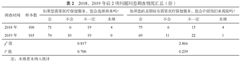 注:2018年收回100份问卷,2019年收回103份问卷;统计为Fisher精确概率法,不清楚和未填者不纳入统计;-:无数据