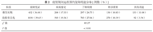 复印用途构成中,报销凭证占首位、其次是了解病情、再次是疾病鉴定(表2)。复印用途构成比差异经χ2检验,P<0.01,差异具有统计学意义,显示疫情不同阶段远程复印用途构成具有差异,疫情防控常态化时期用于报销凭证、了解病情与疾病鉴定的占比显著高于疫情初期。
