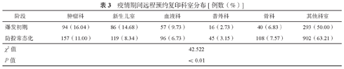 复印数量排首位的是肿瘤科,其次是新生儿室。复印科别构成比差异经χ2检验,P<0.01,差异具有统计学意义,显示疫情不同阶段远程复印科室构成具有差异,疫情防控常态化时期肿瘤科与新生儿室的预约占比显著低于疫情初期(表3)。