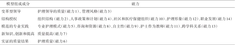 | 模范的专业实践 | 专业护理模式(磁力5)、咨询和资源(磁力8)、自主性(磁力9)、护士作为教师(磁力11)、跨学科关系(磁力13) |