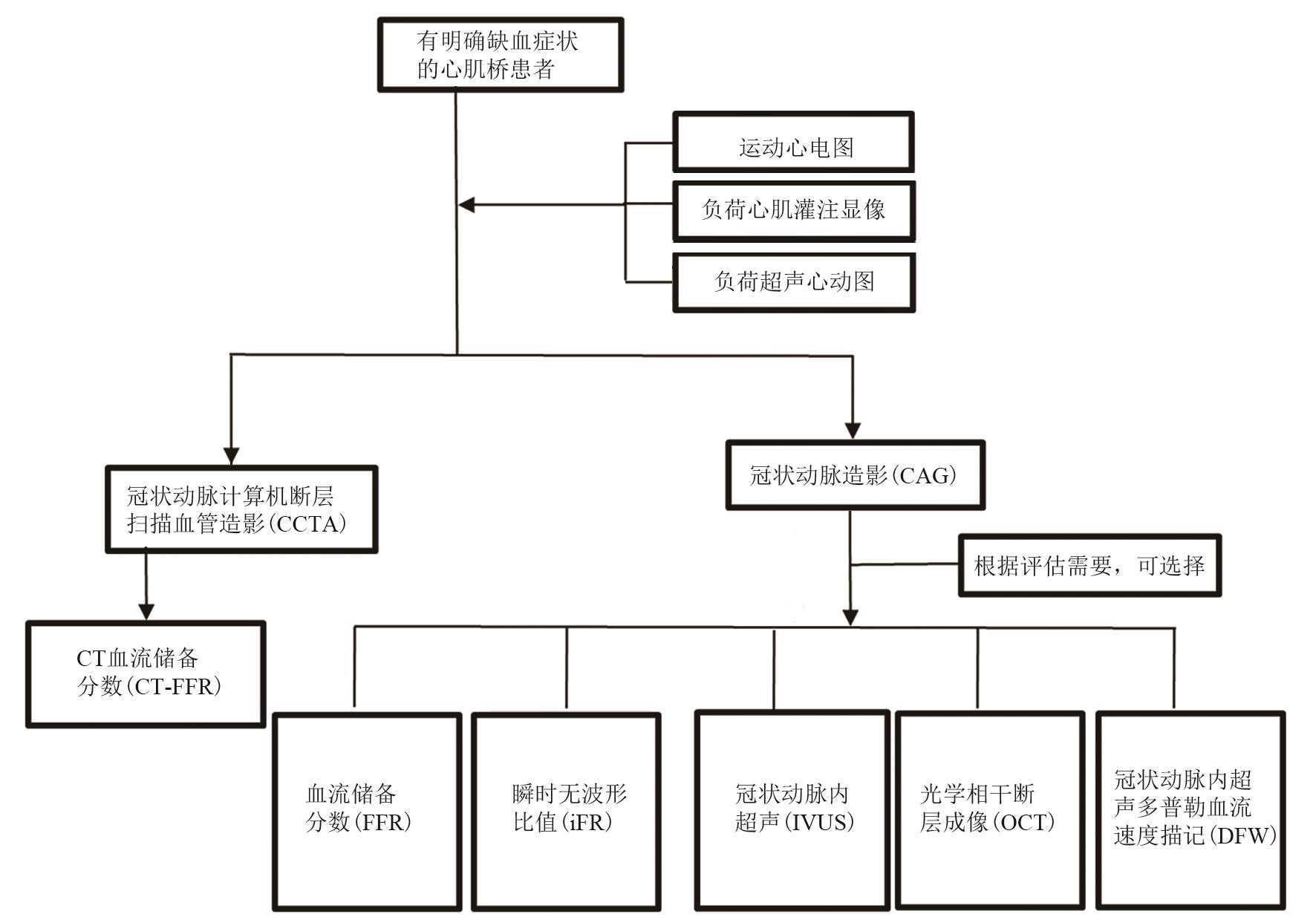 临床上心肌桥的诊断方法主要包括CCTA或CT-血流储备分数(CT-fractional flow reserve,CT-FFR)、CAG,以及腔内影像检查方法如 IVUS或光学相干断层显像(optical coherence tomography,OCT)等。功能性评估方法有:FFR、瞬时无波形比值(instantaneous wave-free ratio,iFR)、多普勒血流速度描记(doppler flow wire,DFW)等检测。另外还有运动心电图、负荷超声心动图、单光子发射计算机断层扫描(single-photon emission computed tomography,SPECT)等方法对心肌桥导致的心肌缺血进行评估。