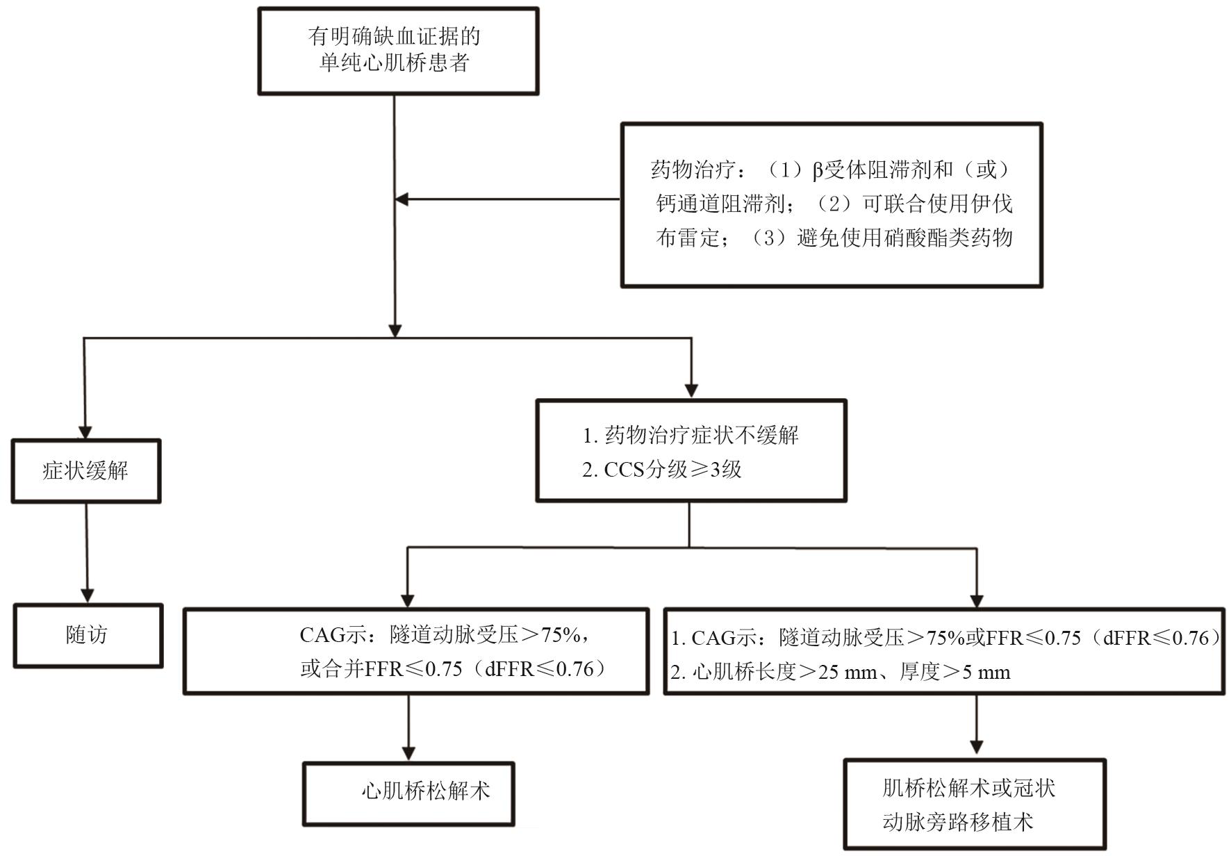 推荐建议:对于存在明确心肌缺血证据的心肌桥患者,如果药物治疗效果不佳,可以考虑通过心肌桥松解术或CABG治疗,以恢复病变冠脉远端的血流供应,从而减轻患者的胸痛症状和改善生活质量。(1)对于有心肌缺血证据的心肌桥患者,首选药物治疗,包括β受体阻滞剂和(或)钙通道阻滞剂,也可联合使用伊伐布雷定。避免使用硝酸酯类药物。(2)不推荐介入支架治疗作为心肌桥的常规治疗手段。(3)对于临床上频繁发作心绞痛且症状重(CCS分级≥3级心绞痛),CAG显示心肌桥压迫冠脉直径>75%,或合并FFR≤0.75(dFFR≤0.76),规范药物治疗不能缓解者,可以考虑外科手术治疗。对不合并心肌桥近端动脉粥样硬化性狭窄者,推荐心肌桥松解术。(4)对于隧道动脉位置深、长度长(心肌桥长度>25 mm,厚度>5 mm)的心肌桥,临床上频繁发作心绞痛且症状重(CCS分级≥3级心绞痛),CAG显示心肌桥压迫冠脉直径>75%,或合并FFR≤0.75(dFFR≤0.76),药物治疗不能缓解患者,外科手术建议行心肌桥松解术或CABG。对合并心肌桥近端重度动脉粥样硬化性狭窄者,推荐CABG。治疗流程图见图2。