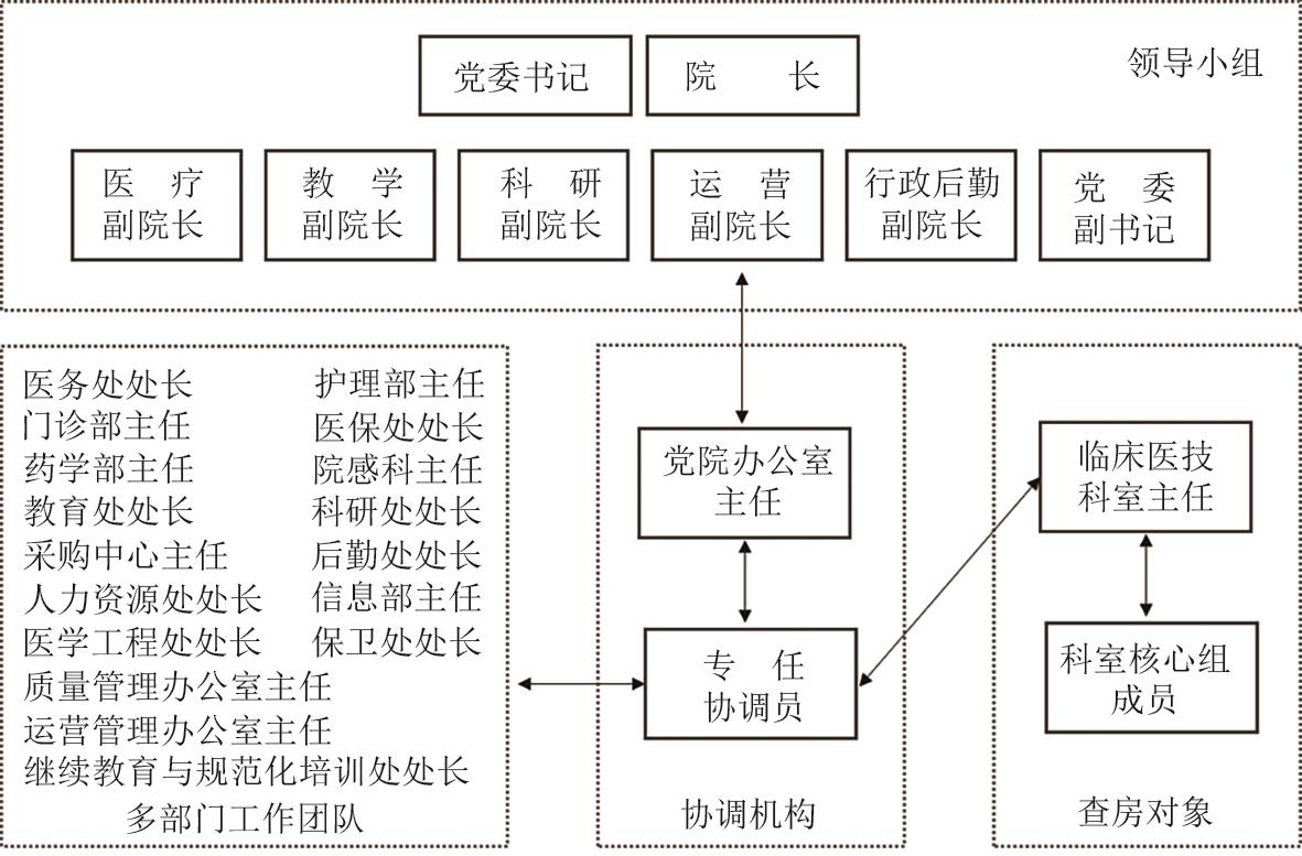 领导小组、协调机构、多部门团队、查房对象共同组成行政查房四方参与机制。医院党委书记、院长为领导小组组长,领导班子成员全员参与,运营副院长承担行政查房具体领导工作。医疗、教学、科研、行政后勤等各职能部门组成多部门工作团队,部门负责人作为团队成员参与其中。医院党委和院长办公室作为组织协调机构,承担行政查房的日常管理并向运营副院长汇报,设2名工作人员专任协调员负责日常协调和全流程管理,与多部门团队和查房科室联络沟通。行政查房四方参与机制架构,见图1。
