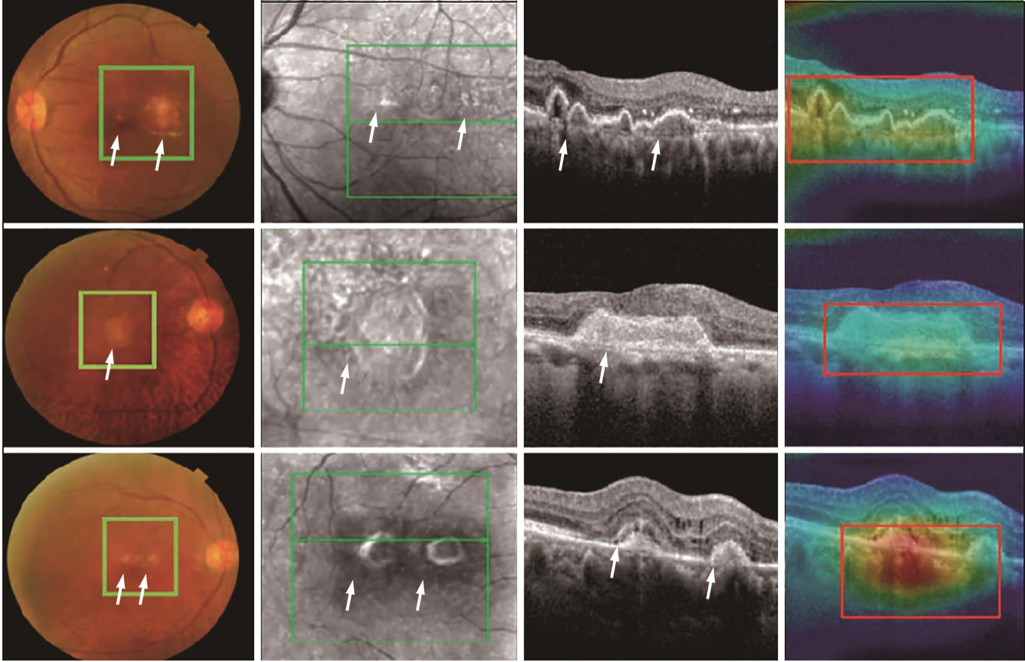 2. AMD的筛查:Burlina等[16]使用超过13万张眼底彩照建立深度卷积网络,识别是否患AMD准确率90%,提示应用深度学习的AMD自动评估模型能够筛选出需要就医的患者。OCT可以识别眼底照中不可见的早期地图样萎缩标志性的高反射灶和视网膜外层变薄(萎缩);因此,OCT较彩色图像对AMD筛查的效果更佳。然而,由于人工与时间成本过高,OCT难以被应用于大规模筛查。龚雁等[17]采用基于弱监督学习的深度学习算法,将ResNet-101深度模型应用于OCT图像的AMD分类中,诊断准确率94.9%,优于CNN-AlexNet、VGG及Google-Net(分别为85.3%、88.7%、89.2%);该模型能够精准定位病灶区域(图1),且相较传统监督学习算法减少了时间精力;提示通过大样本的研究与训练,低成本的基于OCT的AMD筛查普及将成为现实。