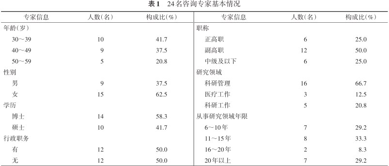本研究共遴选24名专家作为咨询专家组,涉及医院管理、临床医学、医学科研等相关领域。咨询专家基本情况见表1。