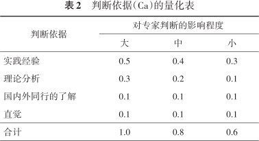 对于遴选的专家团队,要进行专家可靠性分析,包括专家积极系数和专家权威程度[10]。专家积极系数即问卷回收率,可反映专家对研究内容的重视程度。专家的权威程度(Cr)取决于2个因素:判断依据(Ca)和熟悉程度(Cs),计算公式Cr=(Ca+Cs)/2。判断依据(Ca)由实践经验、理论分析、国内外同行了解以及直觉组成,判断依据系数为上述4项得分之和,最大值为l,具体量化值见表2。专家的熟悉程度(Cs)分很熟悉、熟悉、较熟悉、一般、较不熟悉、很不熟悉6个等级,分别按0.9、0.7、0.5、0.3、0.1、0分赋值。