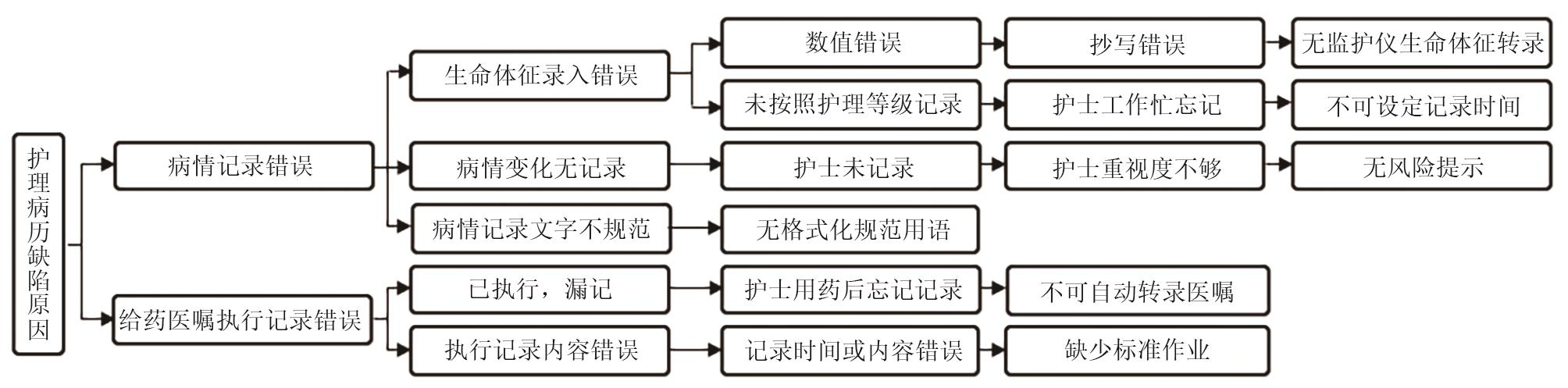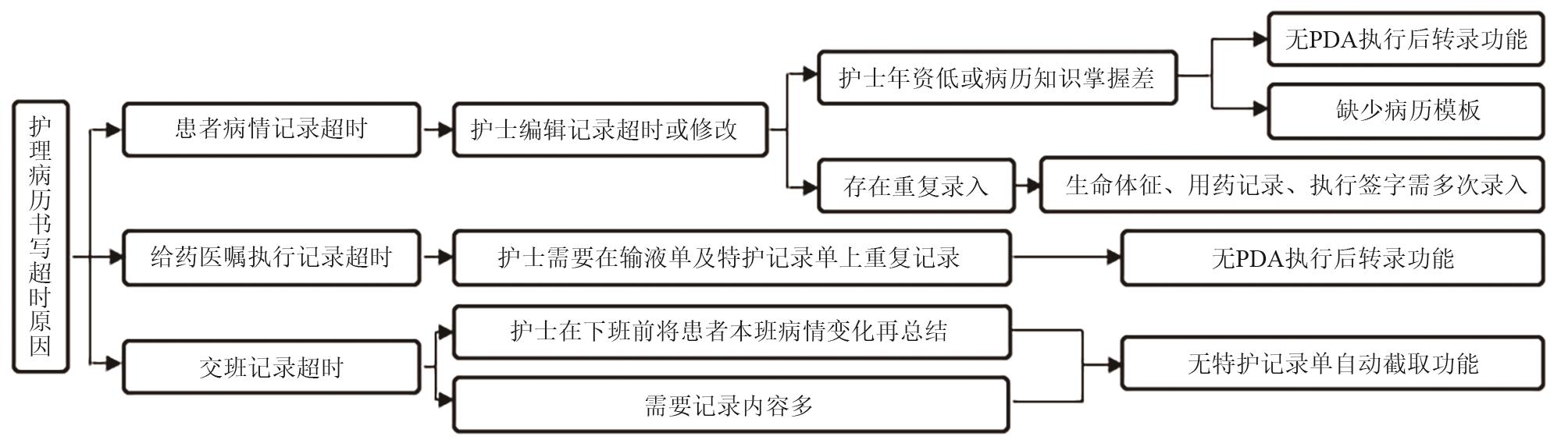 2.病历缺陷原因分析:运用5WHY法分析对照组护理病历缺陷及病历书写超时的根本原因,具体结果见图1,2。护理病历缺陷原因包括病情记录错误和给药医嘱执行记录错误。其根本原因为无监护仪生命体征转录、不可设定记录时间、无风险提示、无格式化规范用语、不可自动转录医嘱、缺少标准作业。护理病历书写超时的根本原因有无个人数字助理(personal digital assistant,PDA)执行后转录功能,缺少病历模板,生命体征、用药记录、执行签字需多次录入,无特护记录单自动截取功能。