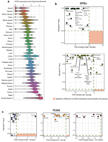 Our data indicate that SARS-CoV-2 may infect other tissues aside from the lungs and infect persons with different sexes, ages, and races equally. The different host immune responses to SARS-CoV-2 infection may partially explain why males and females, young and old persons infected with this virus have markedly distinct disease severity. This study provides new insights into the role of ACE2 in the SARS-CoV-2 pandemic.