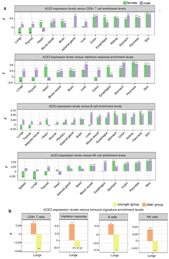 We further analyzed the correlations between ACE2 expression and immune signatures in younger and older populations. In most individual tissues, the correlations between ACE2 expression levels and immune signature enrichment levels displayed consistent trends between younger and older populations. However, in the lungs they had a positive and a negative correlation in the older and younger groups, respectively (Fig. 2b). Again, these results suggest the potential difference in the host immune response to coronavirus infection between young and old persons.