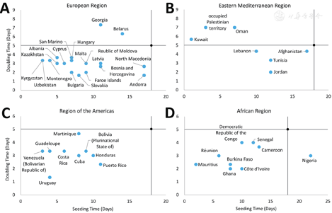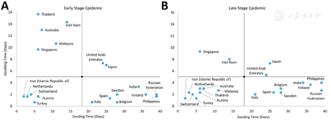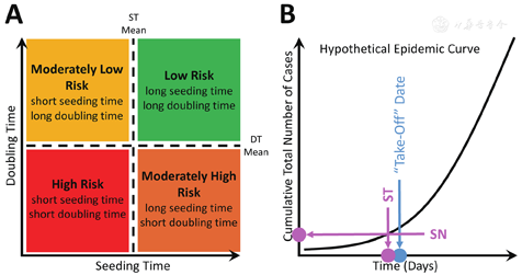 In our seeding time and doubling time (ST/DT) Model, only two major epidemiologic parameters were set specifically for each country—seeding time (ST) and doubling time(DT). ST is the time interval, measured in days, between the date of the first case report in a country (i.e., the country’s index case) and the date on which the cumulative number of confirmed cases reached the seeding number(SN). SN is the total number of cases required to "hatch" an epidemic in a country. It can determine the original introduced risk at the beginning of an outbreak in a country and it influences DT. DT is the time interval, measured in days, required to double the total cumulative number of cases, and it can be an indicator of the effectiveness of control measures. Together, ST and DT can be used to determine the risk of an outbreak "taking off," meaning entering a phase where the numbers of cases grow very rapidly.