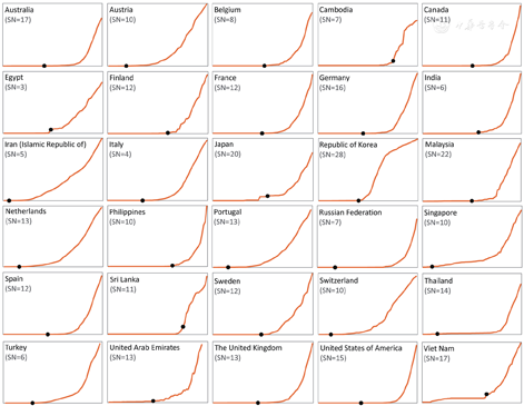 A total of 30 countries met the criteria for inclusion in the determination of median SN. These 30 countries’ epidemiologic curves, epidemic "take-off" points, and individual SNs are shown in Fig. 2. The overall median SN for the 30 countries was 12 days (range: 3–28; interquartile range [IQR]: 10–17). Hence, the SN used for the ST/DT Model was set to 12 cases. Raw and summarized data used to calculate overall median SN can be found in in the Additional file 1: Table S2 and Table S3.