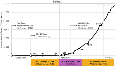 The results of using Belarus as an example country for model validation are shown in Fig. 5. The first case of COVID-19 was reported in Belarus on 28 February. Fourteen days later there were 12 cases and thus, the SN had been reached. So, ST was < 18 days and the mean of the first three DTs was > 5 days, placing Belarus originally in the moderately low risk quadrant of the ST/DT Model (Fig. 4a). However, although testing was being scaled up, cases and first level contacts were being isolated, and some screening was being done at major national entry points, social distancing was only partially implemented, and enforcement was limited [20]. Thus, DT began to shorten—the epidemic was accelerating. Rolling 3DT averages (i.e., average of DT1–3 vs DT2–4 vs. DT3–5, etc.) indicated that mean DT was declining, and Belarus crossed over into the high risk quadrant of the model. Mean DT got as low as~ 3 days, and WHO responded to a request for assistance by visiting, conducting an assessment, and reporting on key recommendations for implementation of enhanced control measures. DT then lengthened again, exceeding 5 days, and Belarus re-entered the moderately low risk quadrant. Although its epidemic is still growing, it is not expanding at the same rapid rate as before.