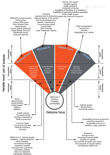 Practitioners and researchers in the midst of overwhelming COVID-19 outbreaks are calling for new ways of looking at such pandemics, with an emphasis on human behavior and holistic consideration [4]. While, in effect, any scientific model could be used to frame SARS-CoV-2 and COVID-19 to generate hypotheses and insights, some models are especially well-suited to thinking about pandemics and to expand comprehensive thinking beyond traditional-albeit useful-ways of looking at viral outbreaks. Pandemics are frequently characterized by intense focus on the evolution, transmission, survival, and pathogenic impact of the virus itself-indeed development of treatments and immunizations rely on understanding these biological elements. Viral outbreaks, however, are also characterized by more socio-behaviorally-oriented public health efforts aimed at reducing and eliminating exposure to the virus and prevention of morbidity and mortality once infected[5,6]. These public health and behavioral efforts involve different forms of science and points-of-view, generally, than do those efforts attempting to understand the virus’ natural history. Often missing from scientific thinking around pandemics are the multi-leveled, complex notions surrounding social and cultural determinants of health and behavior, which focus beyond the individual and their cells to systematic and structural elements in society that additionally contribute to disease and its spread. Engulfing social determinants are power and economic relationships and processes, at micro and macro levels, that subsequently realign causal attention from individuals as the pandemic’s focus of control to larger population aggregations. All of these intersecting dimensions are overlapping, dynamic, and changing. But, whether or not an individual person dies from COVID-19 relates — in part — to them being exposed in the first place (a largely social-environmental phenomenon), the voracity of the virus pitted against one’s cells (a largely bio-pathogenic process), and the ability for that pathogenic process to be interrupted or attenuated (a mix of social and biological processes, including health care systems and practices).