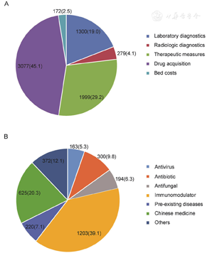 The costs of medical care were paid by health insurance and local government. Costs in this analysis were identified for drugs, radiological examinations, laboratory diagnostic tests, clinical measures, drug prescriptions, and hospitalization. Total costs were calculated from the following cost factors comprising the listed single positions: (i) laboratory diagnostic measures included microbiology, hematology, biochemistry, and blood gas analysis; (ii) radiographic measures included X-ray, computed tomography (CT) and B-mode ultrasonography; (iii) therapeutic measures included supplemental oxygen, hemopurification, salvage, and other measures used for treatment of COVID-19 and comorbidities; (iv) drug acquisition included all drugs indicated by the physician to be necessary for treatment of COVID-19 and comorbidities; (v) bed costs included costs of regular wards and intensive care units. Given that the medical cost in China was not separately accounted for staff expense, these expenditures were included in therapeutic measures. The costs of drugs were further divided according to their efficacy. Expenditures were calculated in US dollars (exchange rate: CNY 7.0= USD 1.0).