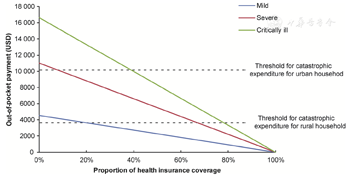 We modelled the potential catastrophic health expenditure due to COVID-19 disease stratified by disease severity. As shown in Fig. 2, when the proportion of health insurance coverage achieved 10% for severe case and 40% for critically ill case, respectively, the urban households could escape from catastrophic health expenditure at estimated threshold value. Among rural households, the proportions should be increased to 70% for severe cases, and 80% for critically ill cases to avoid catastrophic health expenditure (Fig. 2).