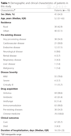 A total of 70 COVID-19 patients were included in the analysis. All patients were treated in isolation. Demographic and clinical characteristics on hospital admission are shown in Table 1. Of 70 patients, 45 (64.3%) were male and 40 (57.1%) lived in urban region. The median age was 52 years (interquartile range: 37–65). Thirty-eight (54.3%) patients had pre-existing diseases. The most common pre-existing diseases was cardiovascular disease (21, 30.0%), followed by endocrine disease (12, 17.1%) and neurological disease (6, 8.6%). According to the national guidelines for disease severity grading, 55 (78.6%) were mild cases, 4 severe cases and 11 critically ill cases. Chinese medicine was noted in all the patients. 98.6% (69/70) and 61.4% (43/70) patients received antivirus and antibiotic treatment, respectively. In addition, immunomodulator (90.0%, 63/70) was another frequently used drug for COVID-19 treatment. Finally, 67 cases were cured, whereas the other 3 died of COVID-19.