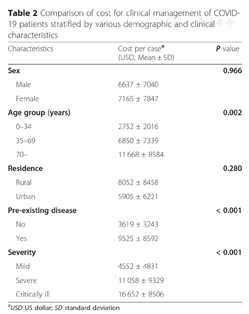 Coronavirus disease 2019 (COVID-19), caused by severe acute respiratory syndrome coronavirus 2 (SARS-CoV-2), is now a global public health threat [1,2]. This virus has the potential to cause widespread pandemic with morbidity and mortality [3]. As of 30 April, 2020, a total of 3 090 445 human COVID-19 cases had been reported to the World Health Organization, including 84 373 cases from China and 3 006 072 cases from 212 countries and regions outside of China; of these, 217 769 were fatal [2]. In view of the striking increase in COVID-19 case numbers outside of China, WHO characterizes COVID-19 as a pandemic [2], highlighting the urgent need for international efforts to halt the rapid progression of its outbreak. In order to support the control of COVID-19, all patients were admitted to hospital in China regardless of disease severity. The Chinese government also declared the implementation of the financial support for COVID-19 since January 2020 (http://www.nhsa.gov.cn/art/202 0/1/23/art_37_2284.html). The costs of medical care were primarily paid by health insurance, and the remaining costs were afforded by local government.