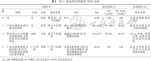 明确糖尿病足感染严重程度及病因是决定其治疗的重要因素。没有适当的分级系统,不同医学中心的糖尿病足感染就诊人群之间缺少客观对比标准,其治疗结局的对比将失去同样重要的统计学意义。因此,应用适当的DFU分级系统对于医护人员规划、制定糖尿病足患者治疗策略至关重要。