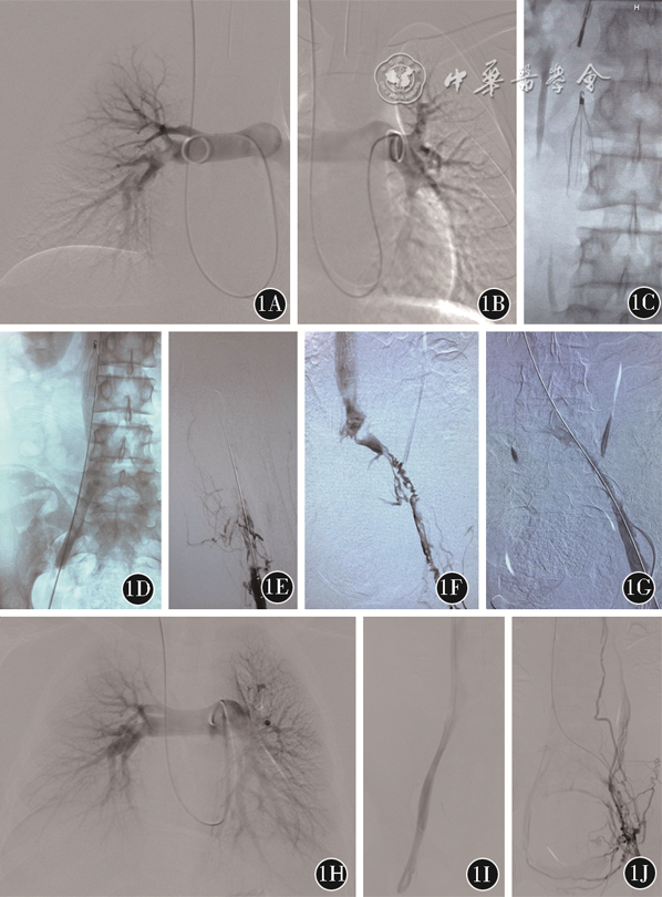 遂于2021年7月22日急诊行肺动脉导管溶栓+下腔静脉滤器置入+髂股静脉血栓清除术(图1)。DSA见右侧髂静脉血栓延续至下腔静脉,选右侧颈静脉入路;双侧肺动脉主干经猪尾导管分别予尿激酶行导管溶栓术(catheter-directed thrombolysis,CDT),左侧5万U,右侧10万U;下腔静脉肾下段放置下腔静脉滤器;分别经左侧腘静脉及右侧股静脉入路,行左侧髂-股静脉、右侧髂静脉及下腔静脉AngioJet药物机械血栓清除治疗(pharmacomechanical thrombectomy,PMT),应用尿激酶左下肢10万U,右下肢5万U;PMT后DSA造影见左侧髂静脉血流恢复,大量附壁血栓,下腔静脉滤器下方未见充盈缺损。术后予低分子肝素(8000 IU,每12 h 1次)皮下注射,左侧足背浅静脉留置针予尿激酶30万U/d,使用3 d,术后恢复良好,于2021年7月28日出院。