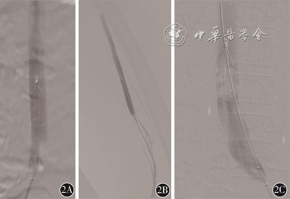 遂于2021年8月9日急诊行下腔静脉滤器置入+髂股静脉血栓清除术(图2)。经右侧股静脉入路于下腔静脉肾下段放置下腔静脉滤器;经左侧腘静脉入路,行左侧髂-股静脉AngioJet PMT,应用尿激酶20万U;术中见左侧股浅静脉血栓疏松,极易脱落至左侧髂静脉、下腔静脉滤器下方,术中指氧监测一过性下降至68%,5 min内自行缓解。术后予低分子肝素(8000 IU,每12 h 1次)皮下注射。于2021年8月16日出院。