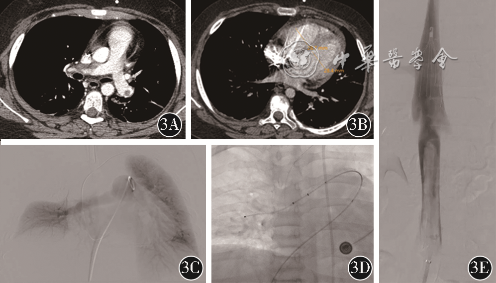 遂于2021年8月24日行肺动脉血栓清除+下腔静脉滤器置入术(图3C、3D)。经右侧股静脉入路,DSA见左侧髂静脉血栓延续至下腔静脉,近端位于肾静脉水平;下腔静脉肾上段放置下腔静脉滤器(图3E);左侧肺动脉主干经猪尾导管予尿激酶5万U行CDT治疗,右侧肺动脉主干予尿激酶15万U行AngioJet PMT,AngioJet治疗期间出现一过性血压下降,收缩压<90 mmHg,3 min后缓解,指氧监测平稳;复造影见右侧肺动脉血流未见明显改善;下腔静脉肾下段尝试AngioJet PMT,血压下降明显,收缩压<70 mmHg,5 min后自行缓解;中止手术。术后入ICU,予普通肝素钠静脉泵入抗凝治疗,维持部分凝血活酶时间50~70 s。术后1周患儿D-二聚体呈一过性升高后稳步下降的典型溶栓曲线(9.9 mg/L ->8.11 mg/L ->3.33 mg/L ->1.48 mg/L ->0.98 mg/L),复查CTPA和CT静脉造影示肺动脉及下腔静脉血栓未见明显变化。患儿术后因垂体疾病尿量控制困难,2021年8月30日出现急性心功能不全、双下肺不张和坠积性肺炎,于2021年9月6日死亡。