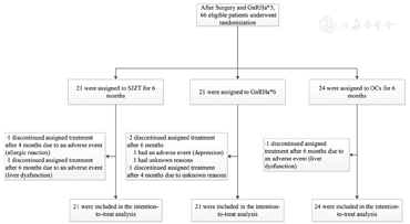 This was a registered (ChiCTR-IPR-17013692), prospective, three-arm, randomized controlled trial (RCT) conducted with the approval of the Institutional Review Board Ethics Committee of the Obstetrics and Gynecology Hospital of Fudan University (2017-50). The randomization number was generated using the STATA statistical software package by Dr. Q.T., who did not participate in other study procedures. The patients received three 28-day cycles of GnRHa (3.75 mg) postoperatively, and at the fourth cycle, each enrolled patient was numbered sequentially and assigned a random number using the random number table. Next, according to random numbers, Dr. Q.T. divided the patients into the following three groups that were treated as indicated: SJZT (1.6 g, three times a day [t.i.d.]), GnRHa (3.75 mg, intramuscularly [i.m.] every 28 days [q28d]), and OCs (drospirenone 3 mg and ethinyl estradiol 0.02 mg, daily [q.d.]), for 6 consecutive months. "Add-back" therapy (estradiol valerate 0.5 mg/d plus dydrogesterone 5 mg/d)[11] was prescribed for patients in the GnRHa group with estradiol levels <30 pg/mL.