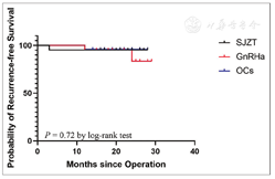 After a median follow-up period of 22 months, four events of symptomatic recurrence were observed in 66 (6.1%) patients without any signs of recurrence on physical examination and imaging checkups. These four patients included one in the SJZT (1/21, 4.8%), two in the GnRHa (2/21, 9.5%), and one in the OCs (1/24, 4.2%) groups. However, there was no significant difference among the three groups, as estimated using Kaplan-Meier analysis [P = 0.72, Figure 2]. The symptoms of recurrence included chronic pelvic pain (VAS = 5) in one patient in the SJZT group, dysmenorrhea (VAS = 8) in two patients in the GnRHa group, and dysmenorrhea (VAS = 7) in one patient in the OCs group.