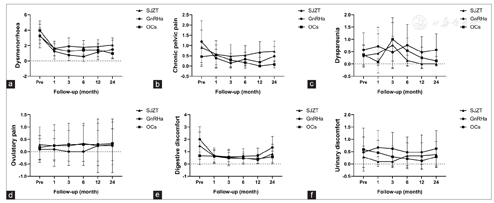 The symptoms of endometriosis have negative consequences on daily life quality; personal relationships; and sexual,[20] digestive, and urinary functions,[21] which also require attention, in addition to symptom relief and recurrence prevention. Consequently, endometriosis should be considered a public health issue rather than just a disease of individuals.[21] The FSFI scores of the SJZT group were higher than those of the GnRHa and OCs groups [Figure 5c]. The rate of adverse events in patients in the Group SJZT was lower than that in the GnRHa group, but similar to that in the OCs group [Table 2]. GnRHa inhibits ovarian function and maintains low levels of estradiol through the hypothalamic-pituitary-ovarian axis to alleviate endometriosis-associated symptoms and reduce endometrial lesions.[22] Patients administered GnRHa treatment for >3 months often show menopausal symptoms, a high incidence of depression, and even sexual dysfunction[23] and could have a high risk of loss of bone density.[24]