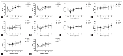 All three regimens showed efficacious pain control. During the 24-month follow-up period, there were no significant differences among the three groups in VAS scores [Figure 3]. In the SJZT, GnRHa, and OCs groups, 62% (13/21), 86% (18/21), and 83% (20/24) of patients had dysmenorrhea; 14% (3/21), 14% (3/21), and 17% (4/24) had dyspareunia; 43% (9/21), 62% (13/21), and 29% (7/24) had digestive symptoms; and 10% (2/21), 14% (3/21), and 17% (4/24) had urinary symptoms preoperatively, respectively [Table 1]. All these symptoms were significantly relieved after treatment. Unfortunately, two patients developed new symptoms after surgery without relief, including one each from the SJZT and GnRHa groups with dysmenorrhea (VAS = 7) and dyspareunia (VAS = 6), respectively. The SF36, CRADI-8, and UDI-6 values were not different among the three groups [Figure 4 and Figure 5a and Figure 3b]. Interestingly, the FSFI scores were significantly improved in the SJZT group compared to those in the GnRHa group (P = 0.00, odds ratio [OR] = 5.25, 95% confidence interval [CI]: 2.09-13.14) and OCs (P = 0.00, OR = 3.94, 95% CI: 1.58-9.83), showing no significant difference between the GnRHa and OCs groups [Figure 5c].