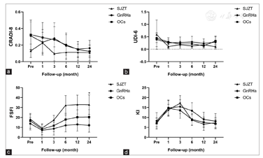 Vercellini et al.[28] found a significant reduction in dyspareunia in patients treated with GnRHa. Nevertheless, sexual function should not only assess using the VAS score of dyspareunia but also involve the evaluation of sexual desire and arousal, orgasmic experiences, and vaginal lubrication. The FSFI questionnaire is one of the best-established tools for the assessment of sexual function in women with endometriosis.[29] Georgopoulos et al.[23] found that women with GnRH deficiency had significantly lower sexual desire than healthy women, which is consistent with the results of our trials. Similar to other hormonal drugs, OCs were associated with a decrease in FSFI, which was also similar to the findings of other RCTs reporting that OCs decreased sexual desire, arousal, and pleasure.[30,31] The possible underlying mechanism is that OCs decrease the levels of androgen,[32] which is involved in the aforementioned functions.[33] van Lunsen et al.[34] reported that maintaining physiological testosterone concentrations by coadministering dehydroepiandrosterone with OCs prevented these effects on sexuality. Although many studies have been conducted, the effects of OCs on sexual function have not been well studied and remain controversial.[35] SJZT is not a hormonal drug and does not have a significant influence on estradiol, liver and kidney function, and emotion, suggesting a potential for good compliance. The anti-inflammatory activity and abirritation might be the reason for the improved FSFI. Further studies on the effect of SJZT on sexual function are needed. Evaluation of digestive and urinary functions is necessary in patients with endometriosis, especially deep endometriosis. However, the CRADI-8 and UDI-6 scores were low in our trial, which indicated that the enrolled patients did not experience severe digestive and urinary system dysfunction, and there was no obvious change during the follow-up period [Figure 5a and Figure 5b]. However, this observation also indicates that the three therapies had few side effects associated with digestive and urinary function. Confirmation of the efficacy of SJZT on endometriosis-associated digestive and urinary discomfort might require a trial that enrolls more patients with related symptoms.