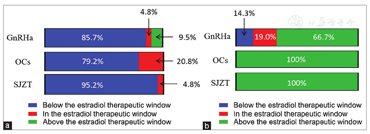 The incidence and types of adverse events differed among the three groups during the different treatment stages [Table 2]. GnRHa decreased the level of estradiol in patients [Figure 6a and Figure 6b], leading to menopausal symptoms. Furthermore, administration of the "add-back" therapy did not relieve the hot flushes and arthralgia in patients in the GnRHa group who still experienced a higher incidence than patients in the SJZT and OCs groups (P = 0.00). However, there was no difference in KI scores among the three groups over time [Figure 5d], and GnRHa treatment increased the incidence of depression.