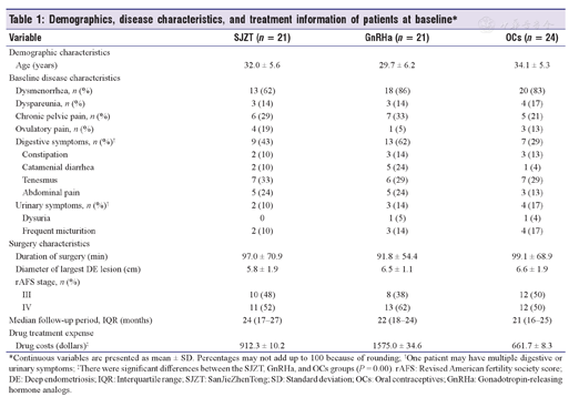 *Continuous variables are presented as mean ± SD. Percentages may not add up to 100 because of rounding; †One patient may have multiple digestive or urinary symptoms; ‡There were significant differences between the SJZT, GnRHa, and OCs groups (P = 0.00). rAFS: Revised American fertility society score; DE: Deep endometriosis; IQR: Interquartile range; SJZT: SanJieZhenTong; SD: Standard deviation; OCs: Oral contraceptives; GnRHa: Gonadotropin-releasing hormone analogs.