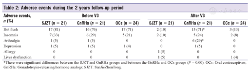 Other adverse events occurred during the follow-up period [Table 2]. After V3, one patient in the OCs group developed liver dysfunction, whereas one patient each in the SJZT group developed allergy and liver dysfunction. Although the side effects were resolved after withdrawal of the drug, these were warnings about the risk of liver damage with SJZT or OCs and allergy from SJZT.