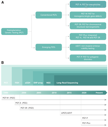 The first report on children born after PGT was published by Handyside et al. in 1990, wherein PCR was employed to detect repetitive Y-sequences for gender determination in families with X-linked diseases[4]. Since then, PGT has evolved from an experimental to a well-established clinical procedure. Along with extensive technical advances in single-cell DNA amplification and genetic testing (Fig. 1B), the technologies that PGT adopted have been markedly advancing in recent years. Notably, next-generation sequencing (NGS) has been increasingly applied in PGT, with a decreased application of the array-based comprehensive genomic hybridization (aCGH) technique. Nevertheless, aCGH is still performed in some clinical laboratories conducting structural variation interrogations, such as chromosomal microarray analysis. Unlike aCGH, single nucleotide polymorphism (SNP) arrays are still widely used in ART; however, owing to the increasing application of NGS, SNP arrays may encounter a decrease in usage. Further, the dramatic development of long-read sequencing (LRS) enables the inclusion of this edge technology in PGT clinics promising.