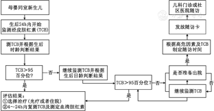 母婴同室病房医护人员应每日监测新生儿黄疸情况,如有高危因素(如溶血等)应增加监测次数;应对家长进行宣教,如果生后24 h内出现黄疸,属于异常情况,需进一步检查和治疗。新生儿黄疸处理及随访流程见图1,详细指引见2014年修订的《新生儿高胆红素血症诊断和治疗专家指南》。