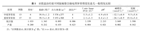 研究期间共纳入30例中重度HIE患儿,其中亚低温治疗前aEEG中度异常组13例(43.3%),重度异常组17例(56.7%)。aEEG中度异常组均为振幅轻度异常和(或)睡眠觉醒周期与胎龄不符;重度异常组中8例为aEEG平坦波,5例为暴发抑制,1例振幅轻度异常伴癫痫样活动,3例振幅重度异常伴癫痫样活动。两组患儿性别、胎龄、出生体重、分娩方式差异无统计学意义(P>0.05)。重度异常组1 min Apgar评分、pH、BE均低于中度异常组,血乳酸水平高于中度异常组,差异有统计学意义(P<0.05)。见表1。