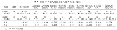 | 生理性GER组 | 16 | 20.3%(1.1%~71.0%) | 36(3~55) | 35(6~55) | 15(0~21) | 2(1~11) | 26(3~38) | 30(4~50) | 56(6~70) | 18(3~48) | 12.1%(0~46.1%) |