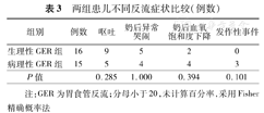 病理性GER组5例呕吐患儿中1例合并心动过缓,1例合并可疑惊厥。两组各症状发生率差异无统计学意义(P>0.05),见表3。