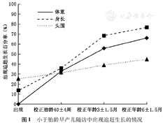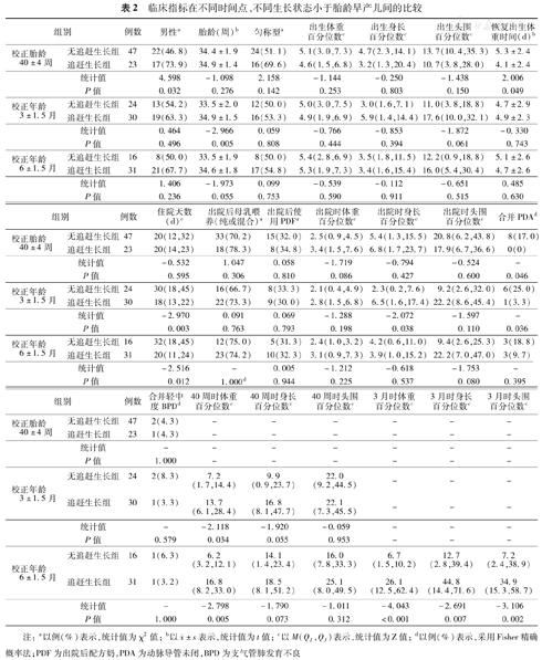 根据校正胎龄40±4周、CA 3±1.5月、CA 6±1.5月时体重有无追赶生长分为追赶生长组和无追赶生长组。