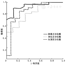 以CA 3±1.5月时体重百分位数预测CA 6±1.5月是否完成追赶生长进行ROC曲线分析,曲线下面积(area under curve,AUC)=0.931(P<0.001),最佳界值为第10.8百分位数,敏感度89.7%,特异度87.5%;CA 3±1.5月身长百分位数预测CA 6±1.5月身长是否完成追赶生长的AUC=0.807(P=0.005),最佳界值为第11百分位数,敏感度80.6%,特异度66.7%;CA 3.5月头围百分位数预测CA 6.5月头围是否完成追赶生长的AUC=0.846(P<0.001),最佳界值为第10.1百分位数,敏感度84.4%,特异度76.9%。见图3。