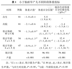 | 时间 | 例数 | 体重Z值a | 体重百分位数b | 较出生时体重百分位数变化(ΔPw)b |