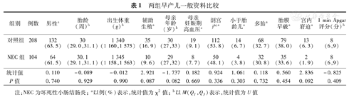 根据患儿出院诊断将罹患NEC(Ⅱ期或Ⅲ期)的患儿纳入NEC组,按1∶2的比例选取胎龄、出生体重相近的非NEC患儿为对照组。