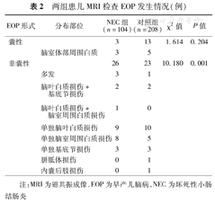 胎龄<32周早产儿NEC与EOP的发生可能具有一定相关性,头颅MRI影像学表现以非囊性损伤为主。