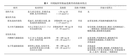| 病因 | 临床特征 | 乳酸值 | 乳酸/丙酮酸 | 其他生化特点 | |