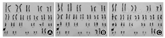 患儿女,第1胎第1产,胎龄36+4周顺产,无窒息,出生体重1 900 g,头围28 cm,身长43 cm,生后1 h因"高危儿"转入。母亲22岁,父亲32岁,体健,非近亲结婚,否认家族遗传代谢病史。否认孕期毒害物质接触史;产检不规律,孕早期有先兆流产,口服安胎药(具体不详)半个月;产检B超示胎儿发育偏小、可疑持续性右脐静脉,唐氏筛查18三体综合征高风险(1∶431),家属拒绝行羊水穿刺检查。入院查体:生命体征平稳,早产儿貌,面圆、扁,眼距宽,眼裂小,下颌短小,鼻梁低平,无口腔狭小及颚弓高深。心肺腹、四肢及神经系统无明显异常。血常规、C反应蛋白、降钙素原无异常,CK-MB 107 U/L,血糖2.05 mmol/L,生后5 d血总胆红素177.9 μmol/L,以间接胆红素为主。FT3正常,FT4降低,TSH升高。患儿入院后2 d无明显诱因出现双眼周瘀青,APTT 113.3 s,PT 22.7 s,Fg 2.77 g/L。眼底检查示双眼ROP Ⅱ区1期;心脏彩超示动脉导管未闭;腹部彩超、头颅磁共振成像、脑干听觉诱发电位均无明显异常;TORCH阴性。染色体核型约90.1%为46,XX,r(13)(p13;q34);6.3%为45,XX,-13;3.6%为46,XX,r(13;13)(p13q34;p13q34),见图1。诊断Patau综合征。予优甲乐口服、维生素K1肌肉注射及营养支持等治疗,生后9 d出院,吃奶40~50 ml/次。现患儿4月余,体重5.25 kg,身长59 cm,头围34.5 cm,抬头不稳,不能翻身,因家属拒绝未行基因芯片技术检测,未复查心脏彩超。